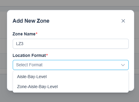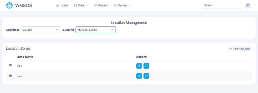 Selecting a customer and building will display the current location zones. These are areas of the warehouse which contain specific locations.